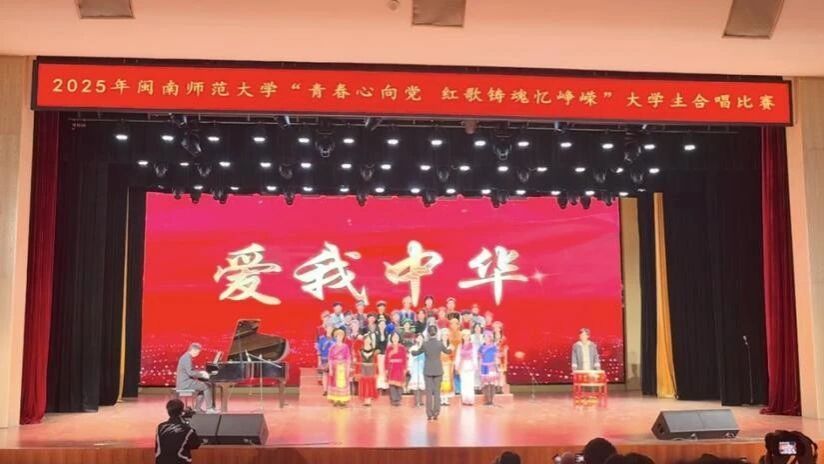 “五十六个星座,五十六枝花,五十六族兄弟姐妹是一家……”当清澈而富有感染力的歌声在场上响起,合唱团成员们以一曲《爱我中华》唱出了中华民族大家庭的团结与温情。舞台上,我院来自14个民族的同学们神情坚定,情感真挚,每一个音符都凝聚着中华民族共同体的深厚情谊,每一个和声都彰显着团结一心跟党走的坚定信念。