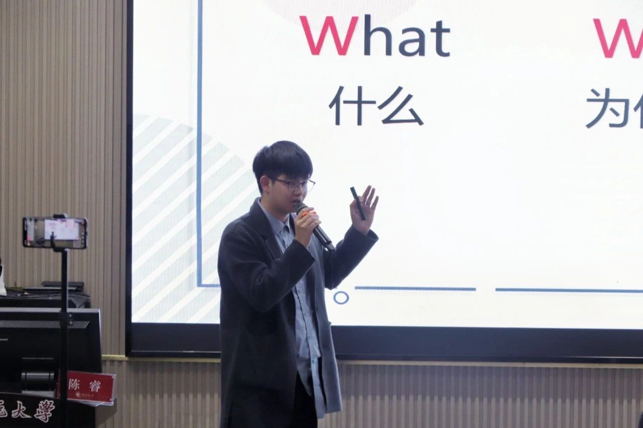 陈睿以“传师范经验,做未来明师”为主题进行经验分享。他围绕个人成长转变、教学技能进阶两大板块展开分享,讲述自己从大一迷茫师范生逐步成长为即将毕业准教师的历程,介绍“多思考”的学习方式和“敢尝试”的实践途径。他以“名师亦有,明师更贵”与同学们共勉。