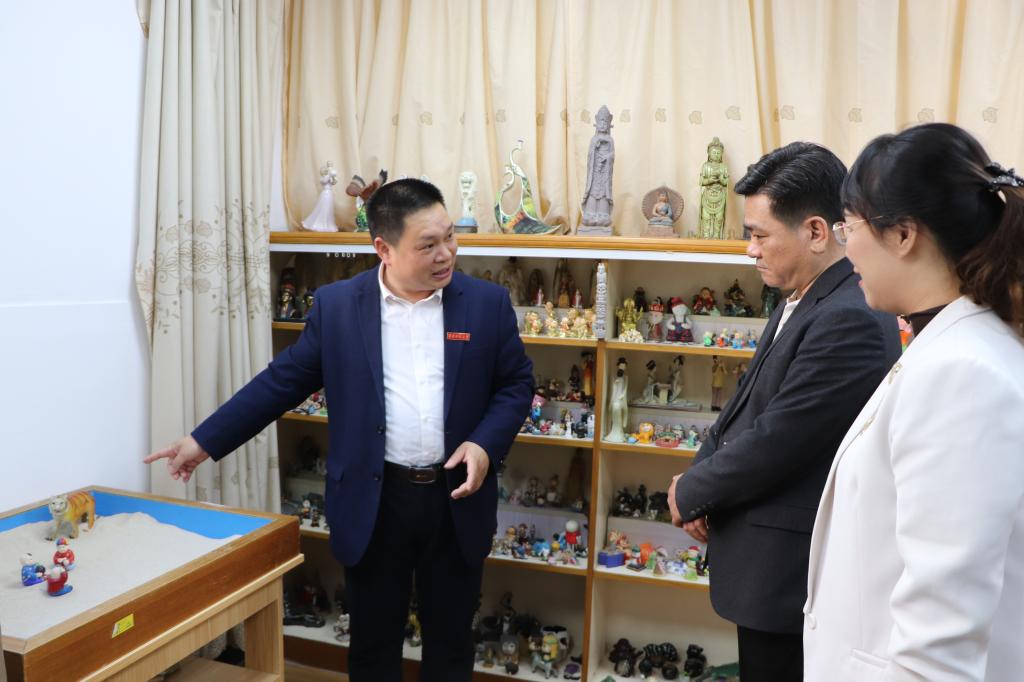 调研组参观了团体箱庭实训室、行为科学实验室、心理咨询实训室、感觉统合实训室等心理辅导功能室,陈顺森教授对各功能室的服务项目和适应人群进行了详细讲解。
