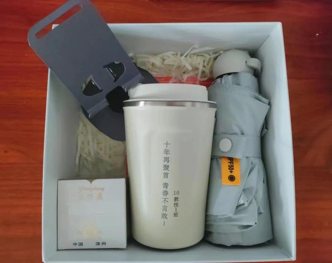 座谈会上,一段短视频将校友们拉回了往昔岁月,老师和同学们共叙芳华记忆。随后,班长黄慧煌讲解了聚会四件伴手礼的深厚寓意,第一件是雨伞,蕴意纵使“栉风沐雨”,也有人为你遮风挡雨;第二件是杯子,蕴意大家要饮水思源,缘木思本,不忘来时路;第三件是手机支架,蕴意用青春的信念支撑起人生的梦想;第四件是片仔癀珍珠膏,蕴意青春不减年少,归来仍是少年。